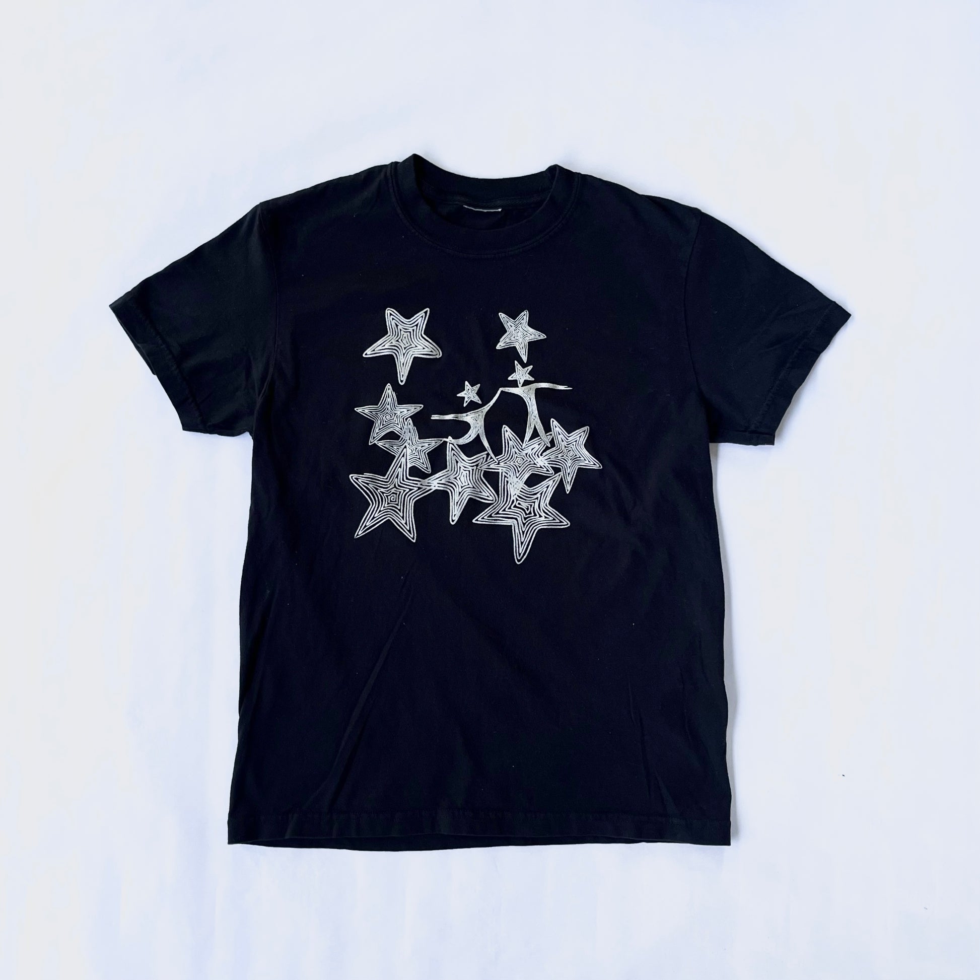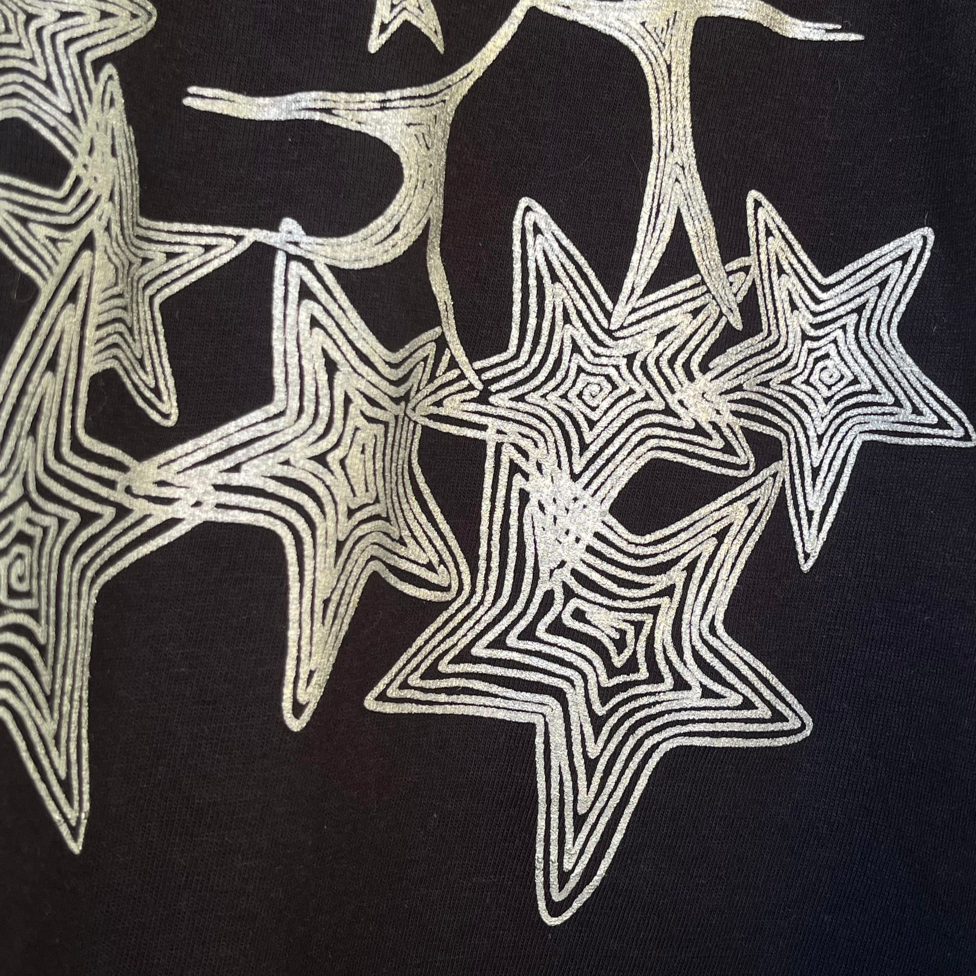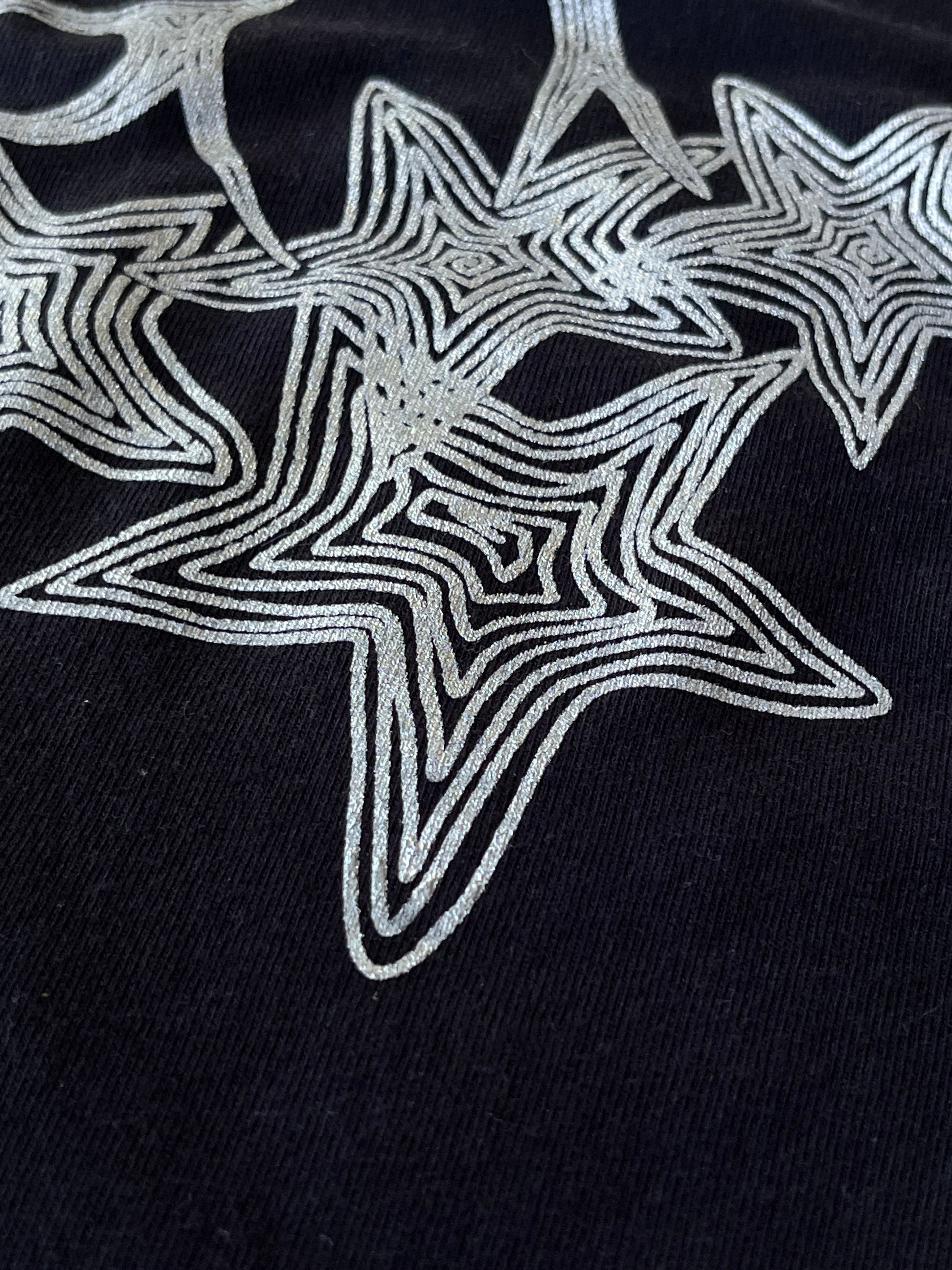 Our "Dancing on the Stars" tee is screen printed in metallic silver paint.