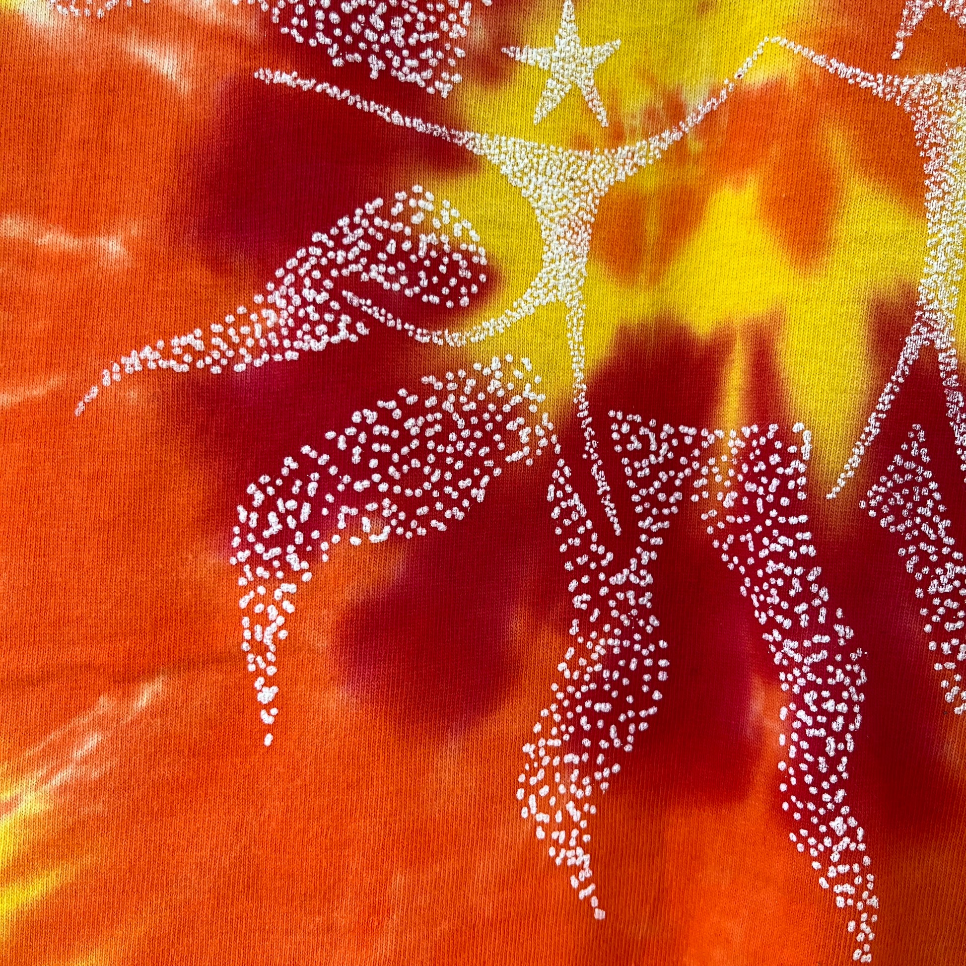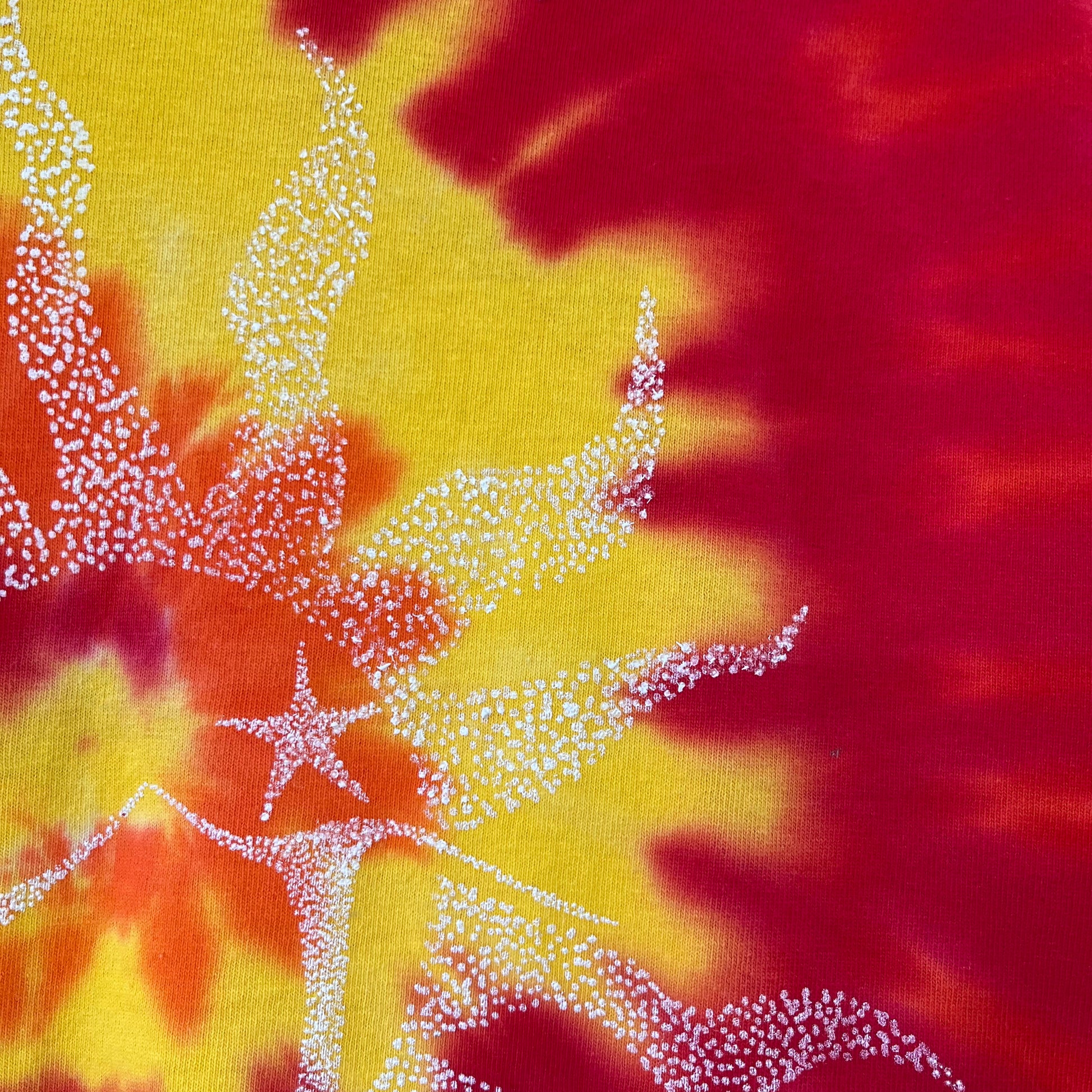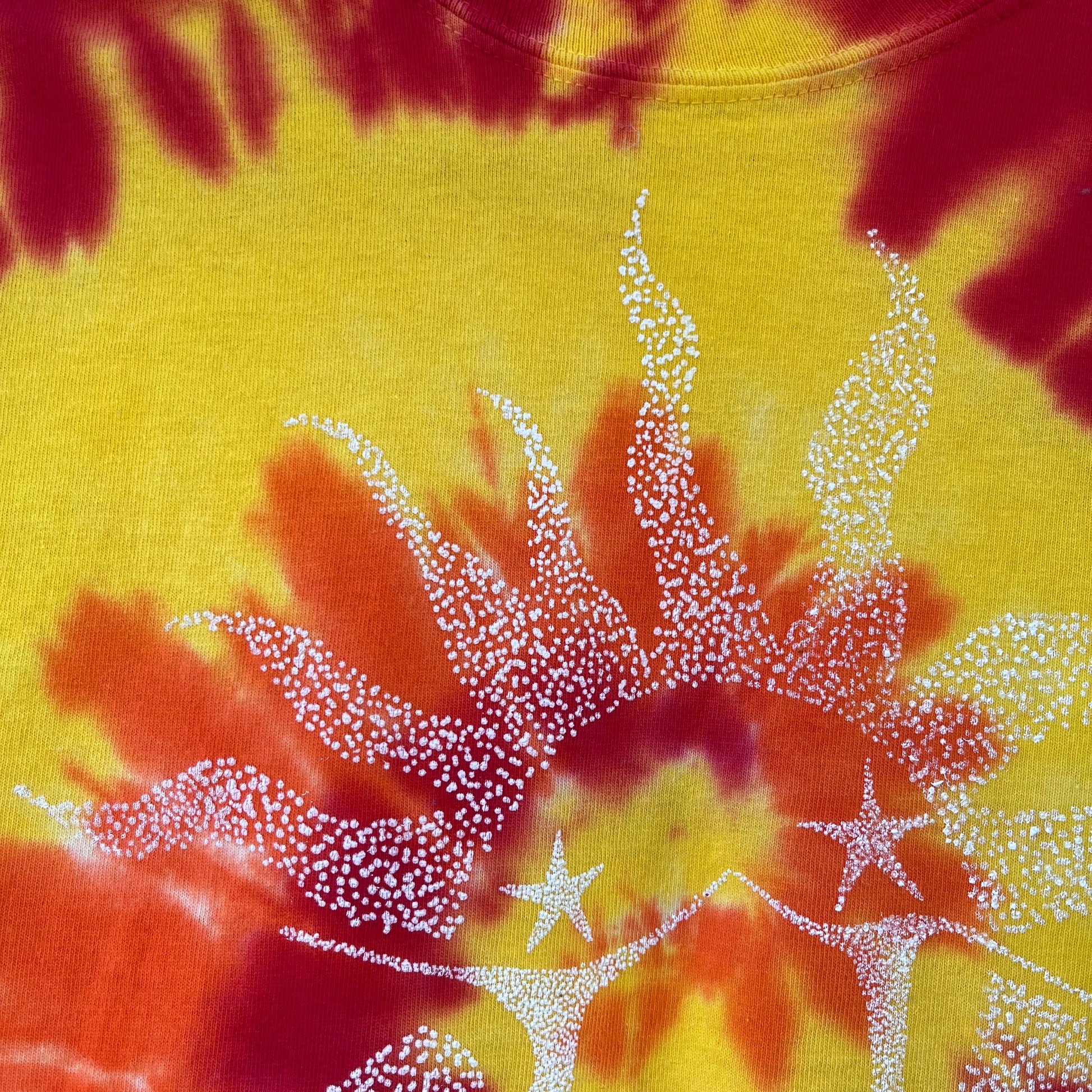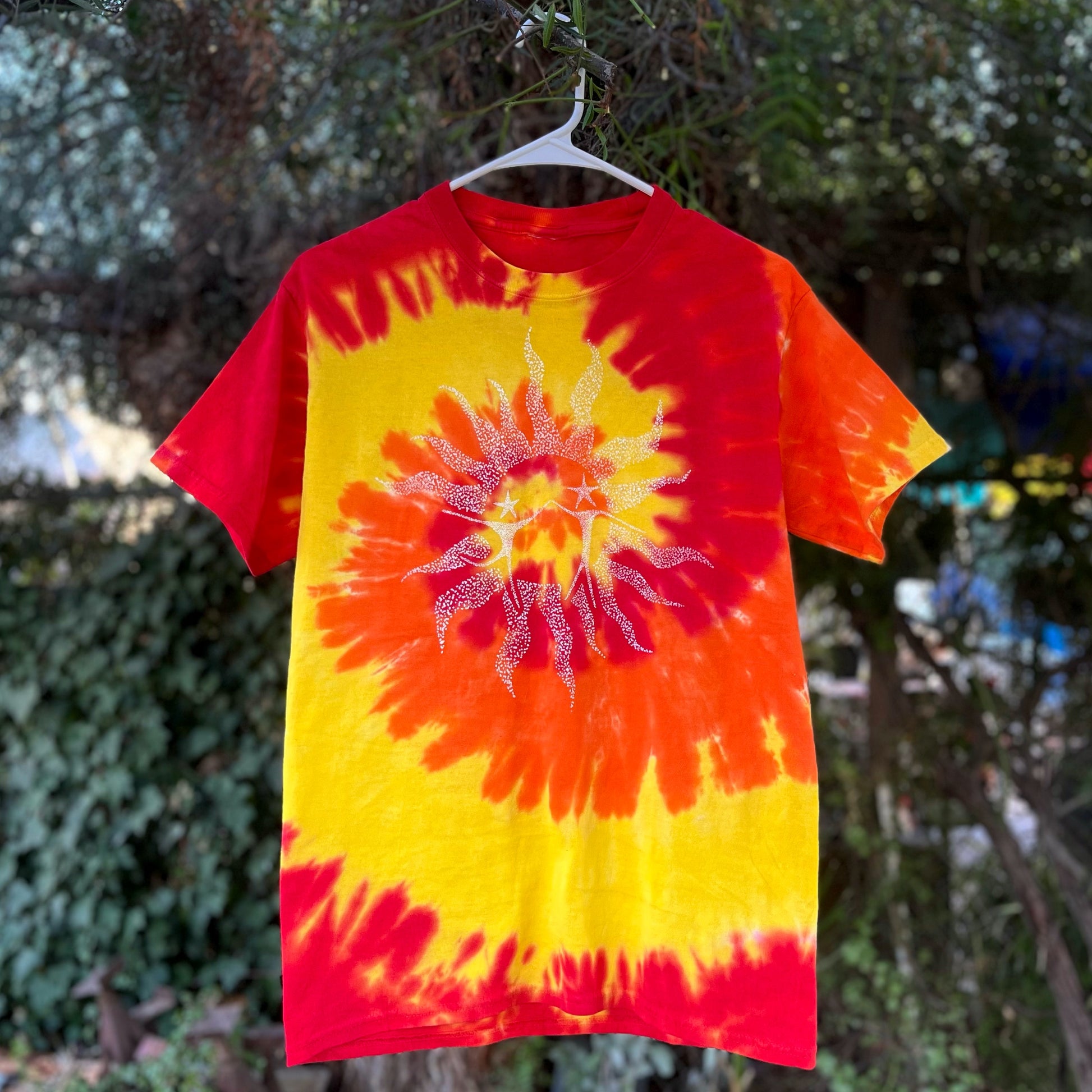 Our "Dancing in the Sun" tie dye shirt is screen printed and each tie dye tee is unique, no two shirts are the same.
