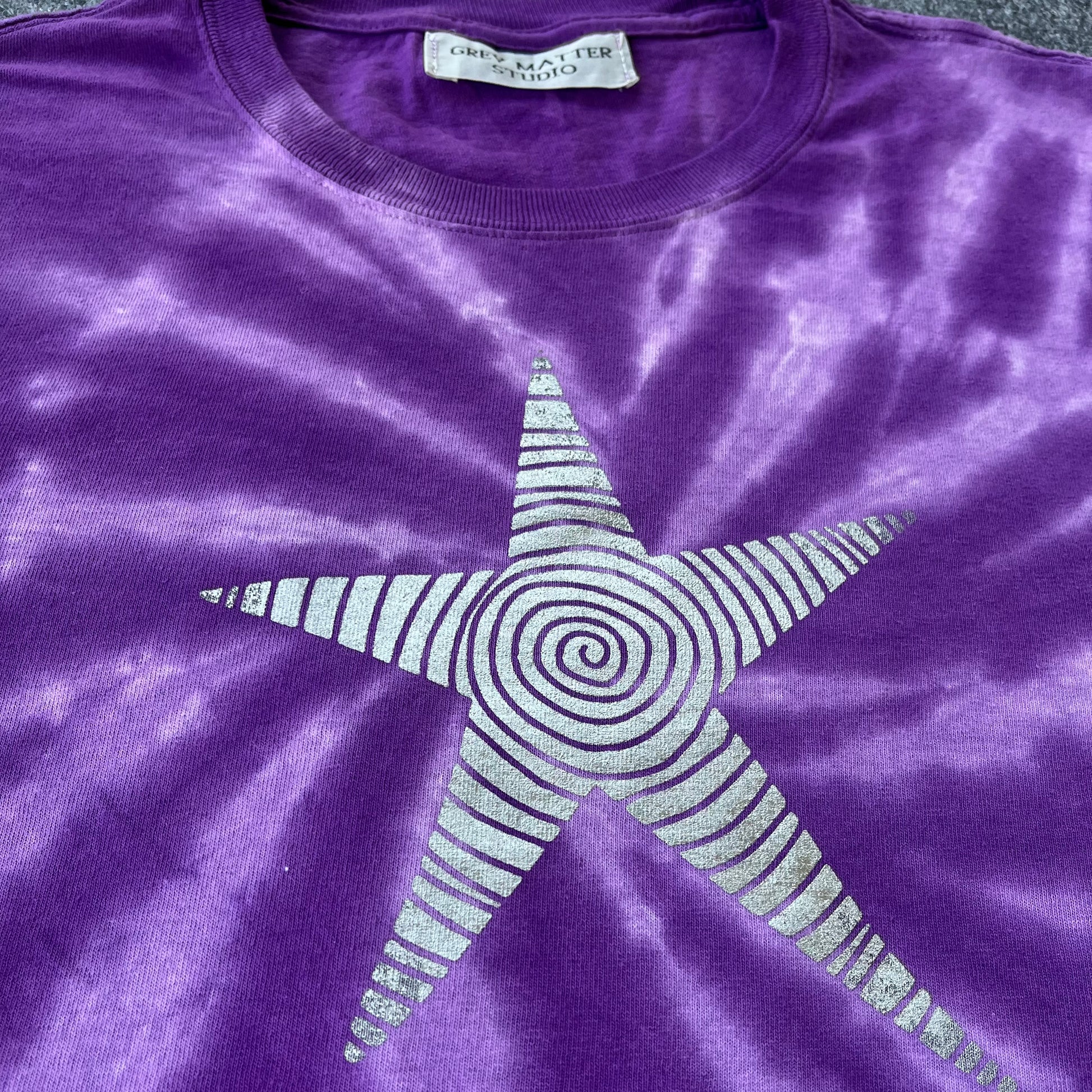 Our "Inspirational Dizzy Star" tie dye shirt is screen printed and each tie dye tee is unique, no two shirts are the same.